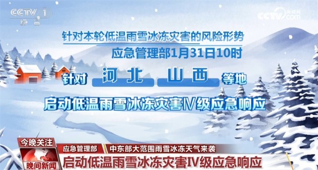 針對本輪低溫雨雪冰凍災(zāi)害的風(fēng)險形勢,應(yīng)急管理部1月31日10時,針對河北、山西等地啟動低溫雨雪冰凍災(zāi)害Ⅳ級應(yīng)急響應(yīng)。同時,國家防災(zāi)減災(zāi)救災(zāi)委員會辦公室、應(yīng)急管理部等部門派出2個工作組分赴河南和湖北,協(xié)助指導(dǎo)低溫雨雪冰凍災(zāi)害防范應(yīng)對工作。中國氣象局1月31日上午啟動重大氣象災(zāi)害(雨雪冰凍)Ⅲ級應(yīng)急響應(yīng)。
