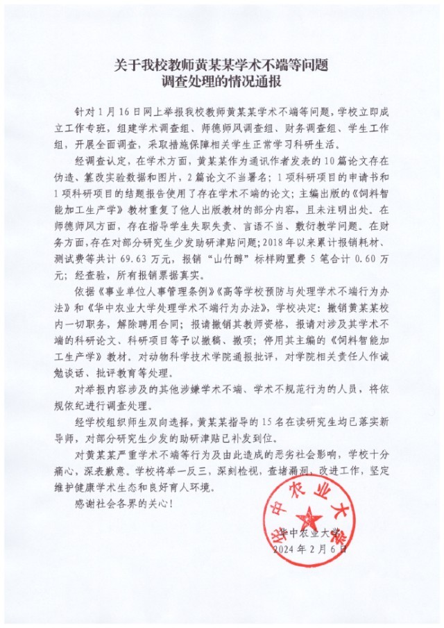 華中農(nóng)業(yè)大學(xué)通報:教師黃某某學(xué)術(shù)不端等問題調(diào)查處理的情況