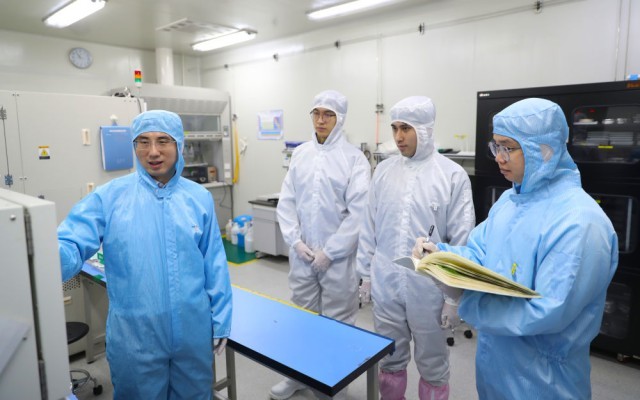 在位于沈陽市的中國科學院金屬研究所納米碳基電子器件超凈實驗室,孫東明(左一)與指導的研究生一起討論反應(yīng)離子刻蝕工藝設(shè)備的使用方法和注意事項(2月24日攝)。