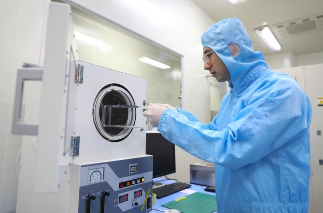 在位于沈陽市的中國科學院金屬研究所納米碳基電子器件超凈實驗室,孫東明從前處理設(shè)備腔體中取出實驗樣品(2月24日攝)。