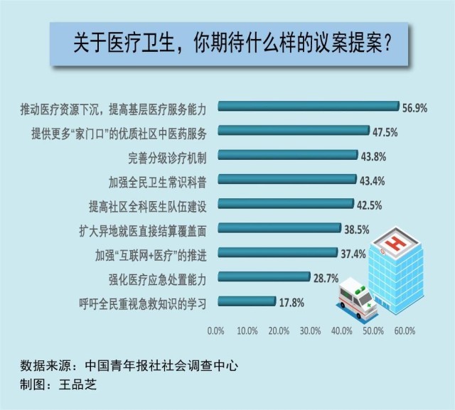 每年全國(guó)兩會(huì),醫(yī)療衛(wèi)生都是代表委員們熱議的話題。在全國(guó)兩會(huì)召開(kāi)前夕,中國(guó)青年報(bào)社社會(huì)調(diào)查中心聯(lián)合問(wèn)卷網(wǎng)(wenjuan.com),進(jìn)行了全國(guó)兩會(huì)青年期待調(diào)查,共有2002人參與。調(diào)查顯示,在兩會(huì)關(guān)于醫(yī)療衛(wèi)生領(lǐng)域的議題中,56.9%的受訪者最期待推動(dòng)醫(yī)療資源下沉,提高基層醫(yī)療服務(wù)能力,47.5%的受訪者期待提供更多“家門口”的優(yōu)質(zhì)社區(qū)中醫(yī)藥服務(wù)。