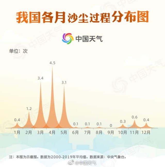 常年統(tǒng)計來看,我國沙塵天氣過程在一年中一般首次出現(xiàn)在2月,3-5月進入高發(fā)期。從我國2000-2019年各月沙塵天氣過程的分布情況來看,3-5月的沙塵過程能占到全年的80%,4月份沙塵天氣最為頻繁,常年平均達到4.5次,3月和5月不相上下,分別為3.4次和3.1次。