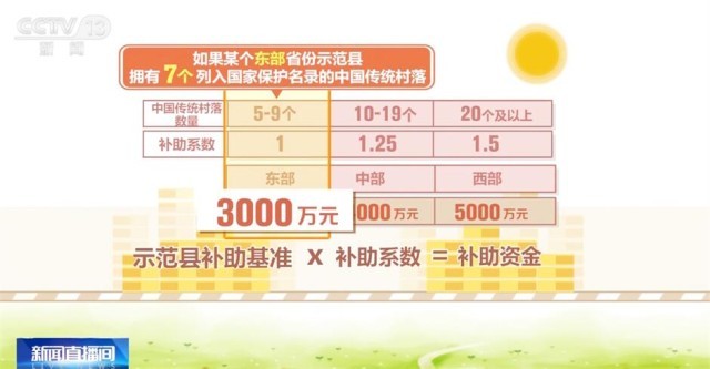 根據(jù)規(guī)定,中央財(cái)政對(duì)傳統(tǒng)村落集中連片保護(hù)利用示范縣予以定額獎(jiǎng)補(bǔ),其中東、中、西部示范縣補(bǔ)助基準(zhǔn)分別為3000萬(wàn)元、4000萬(wàn)元、5000萬(wàn)元。同時(shí),根據(jù)示范縣擁有中國(guó)傳統(tǒng)村落數(shù)量情況賦予相應(yīng)獎(jiǎng)補(bǔ)系數(shù),擁有5—9個(gè)、10—19個(gè)、20個(gè)及以上中國(guó)傳統(tǒng)村落的示范縣補(bǔ)助系數(shù)分別為1、1.25、1.5。每個(gè)示范縣的補(bǔ)助資金為相應(yīng)的補(bǔ)助基準(zhǔn)乘以補(bǔ)助系數(shù)。舉個(gè)例子,如果某個(gè)東部省份示范縣擁有7個(gè)列入國(guó)家保護(hù)名錄的中國(guó)傳統(tǒng)村落,中央財(cái)政將對(duì)這個(gè)示范縣進(jìn)行3000萬(wàn)元獎(jiǎng)補(bǔ)。