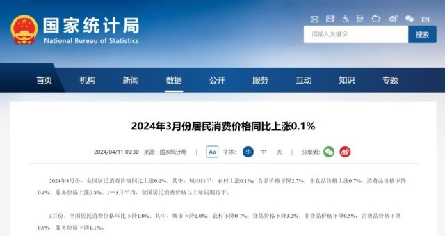 國家統(tǒng)計(jì)局:3月份居民消費(fèi)價(jià)格同比上漲0.1%