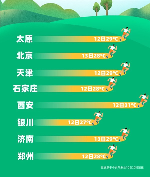 華北、黃淮、西北地區(qū)東部等地的氣溫沖勁也很猛,12日至13日氣溫將達(dá)到近期高點(diǎn),山西、河南、河北等局地還可能有30℃的氣溫冒頭,暖熱程度堪比常年5、6月。