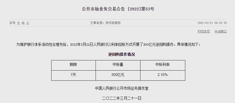 中新財(cái)經(jīng)3月21日電 3月21日,為維護(hù)銀行體系流動(dòng)性合理充裕,人民銀行以利率招標(biāo)方式開(kāi)展了300億元7天期逆回購(gòu)操作,中標(biāo)利率為2.10%。(完)
