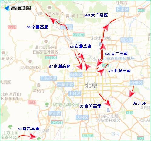 4日、5日12至20時(shí),進(jìn)京方向的交通壓力將明顯上升,其中京藏高速八達(dá)嶺、居庸關(guān)、西三旗、北沙灘,京承高速黃港、太陽宮,京港澳高速西道口、琉璃河,京開高速榆垡、玉泉營(yíng)等路段車流較為集中。