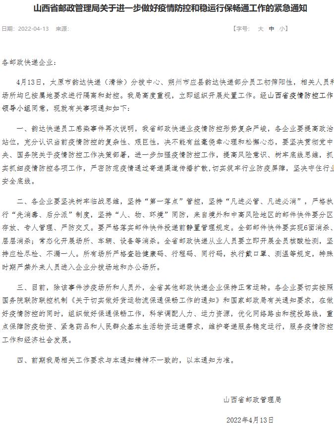 中新財經(jīng)4月15日電 13日,山西省郵政管理局發(fā)布通知緊急部署行業(yè)疫情防控和穩(wěn)運行保通暢工作 ,要求全省從業(yè)人員要立即開展全員核酸檢測,堅持應檢盡檢、不漏一人。除此次涉疫場所外,全省其他郵政快遞企業(yè)均保持正常運轉(zhuǎn)。