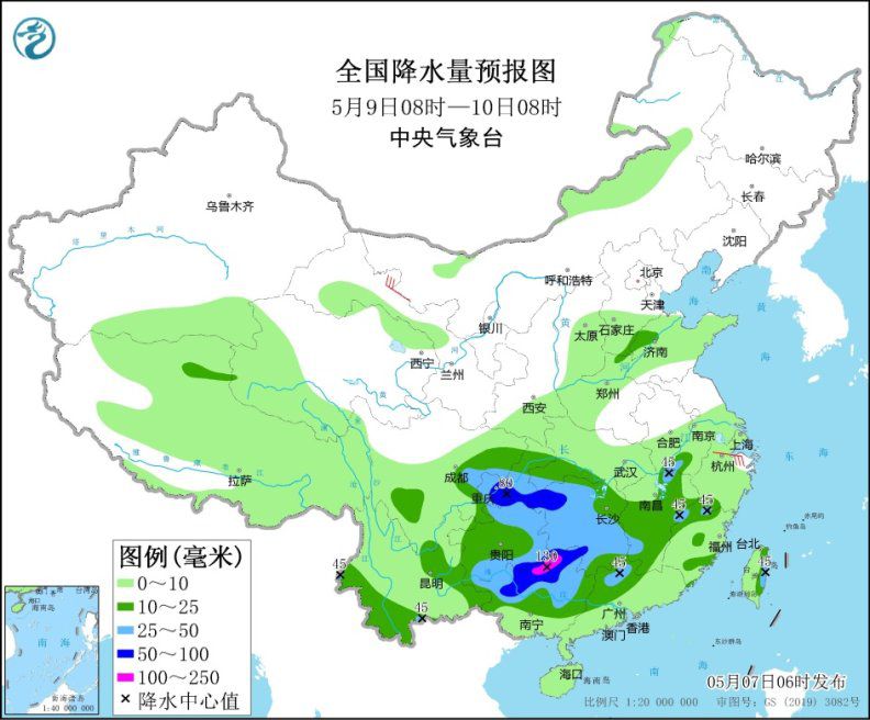 5月8日08時(shí)至9日08時(shí),甘肅南部、陜西北部和西南部、山西中部、河北南部、四川盆地西部、貴州西部和南部、云南東部和南部、湖北東南部、江西、湖南東部和南部、廣西、廣東北部、福建南部等地的部分地區(qū)有中到大雨,其中,四川盆地西部和南部、廣西北部和南部等地局地暴雨(50~90毫米)。新疆北部、江南東部、西藏中北部等地的部分地區(qū)有4~6級(jí)風(fēng)(見圖2)。