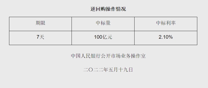 央行5月19日開展100億元逆回購(gòu)操作 中標(biāo)利率2.10%