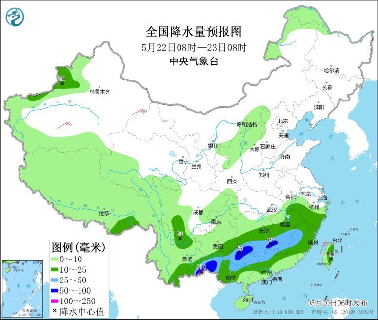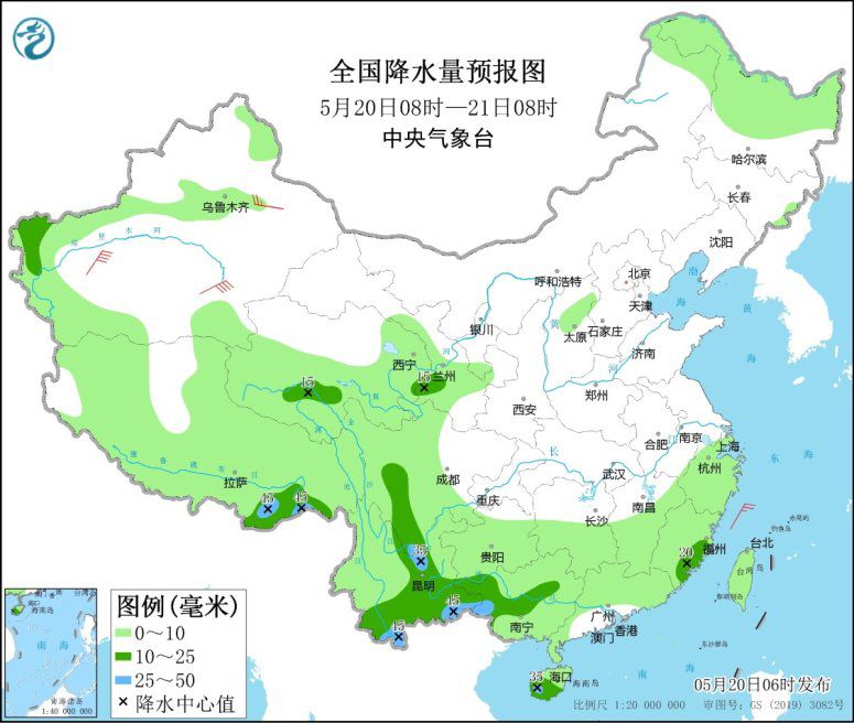 5月20日8時至21日8時,西藏北部、青海南部的部分地區(qū)有小到中雪或雨夾雪;云南中東部和南部、四川南部、廣西西部和中部、福建東部、海南島等地的部分地區(qū)有中雨,局地大雨(25~45毫米)。新疆南疆盆地等地的部分地區(qū)有4~6級風。