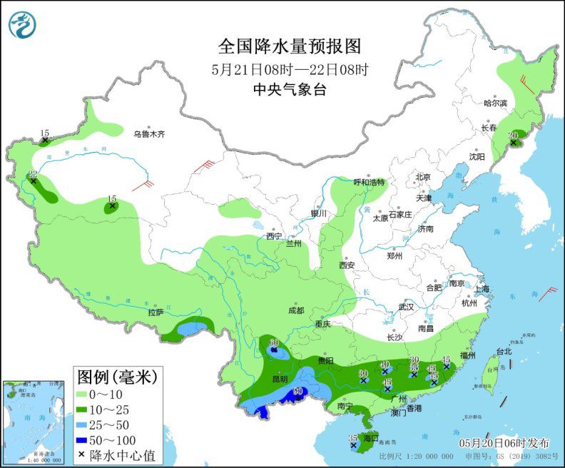 全國降水量預(yù)報圖(5月20日8時-21日8時)