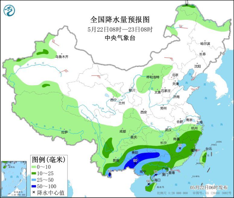 5月22日08時(shí)至23日08時(shí),西藏、青海西南部等地有小雨或陣雨,高海拔地區(qū)有小到中雪或雨夾雪;江南東部和南部、華南大部、貴州中南部、云南南部、黑龍江西北部等地部分地區(qū)有中到大雨,其中,云南南部、貴州南部、廣西北部、湖南南部、廣東西南部沿海等地部分地區(qū)有暴雨(50~90毫米)。新疆北部和南疆東部、甘肅北部、內(nèi)蒙古西部和東部等地部分地區(qū)有4~6級(jí)風(fēng)。