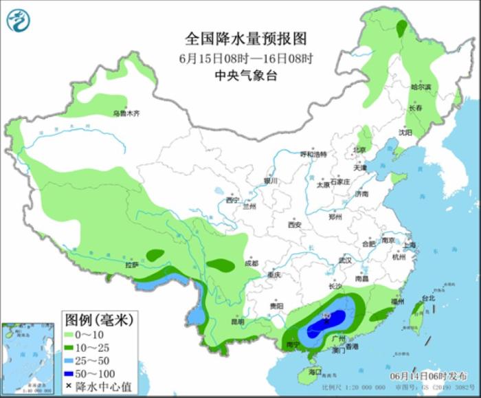 全國降水量預(yù)報圖(6月14日08時-15日08時)