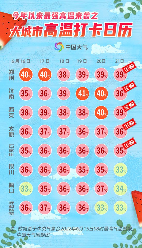 中國天氣網(wǎng)訊 今年以來最強高溫來襲!今(6月15日)起到22日,北方高溫強勢返場,鄭州、濟南等地最高氣溫可達40℃或以上,部分地區(qū)高溫持續(xù)時間之長、強度之強都是同期少見。中國天氣網(wǎng)推出大城市高溫打卡日歷,看哪些地方未來6天高溫全勤到崗。