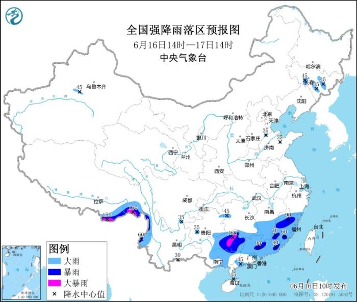 中新網6月16日電 據(jù)中央氣象臺網站消息,中央氣象臺6月16日10時繼續(xù)發(fā)布暴雨藍色預警:預計,6月16日14時至17日14時,福建、江西南部、湖南南部、廣東大部、廣西中東部以及云南西北部、西藏東南部等地的部分地區(qū)有大到暴雨,局地大暴雨(100~160毫米)。上述部分地區(qū)伴有短時強降水(最大小時降雨量20~50毫米,局地可超過60毫米),局地有雷暴大風等強對流天氣。