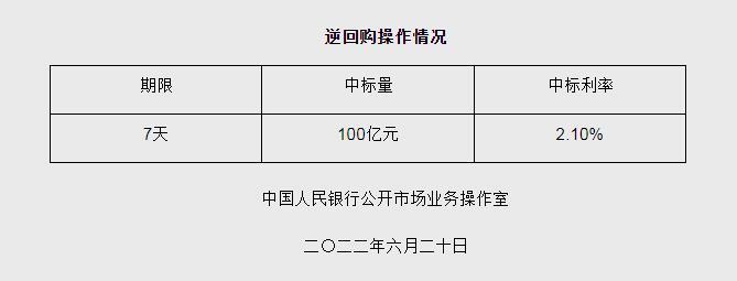 央行6月20日開展100億元逆回購(gòu)操作 中標(biāo)利率2.10%