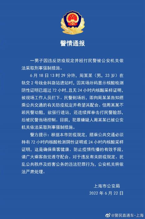 6月18日13時29分許,周某某(男,33歲)在軌交2號線金科路站進站時,因其場所碼顯示核酸檢測陰性證明已超過72小時,且無24小時內核酸采樣證明,被現(xiàn)場工作人員攔下。民警到場后,即向周某某告知搭乘公共交通的有關防疫規(guī)定并希望其配合。但周某某不顧民警勸阻,欲強行進站,還連續(xù)揮拳擊打民警臉部,后被民警當場控制。目前,犯罪嫌疑人周某某已被公安機關依法采取刑事強制措施。