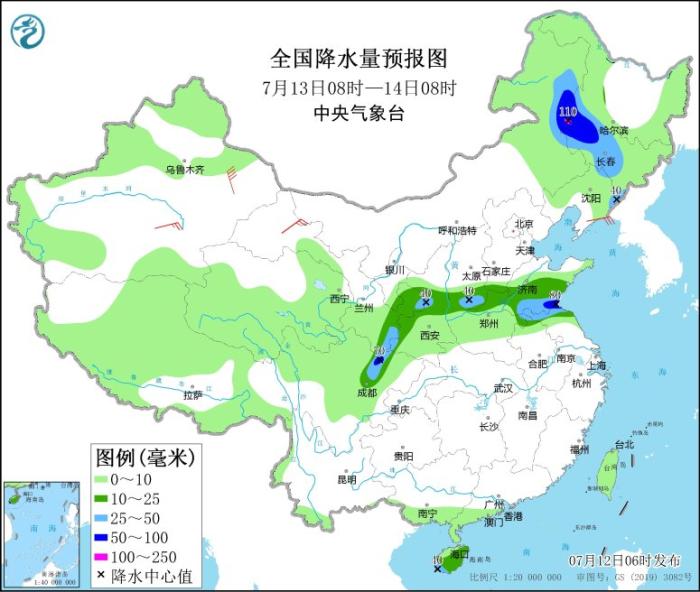 7月13日08時至14日08時,內(nèi)蒙古東部、黑龍江西南部、吉林、遼寧東北部、甘肅東南部、陜西中部和西南部、山西南部、河南北部、河北南部、山東中南部、四川盆地西北部、海南島等地部分地區(qū)有中到大雨,其中,內(nèi)蒙古東北部、黑龍江西南部、吉林西部、山東南部等地部分地區(qū)有暴雨或大暴雨(100~110毫米)。新疆南疆盆地、甘肅河西等地部分地區(qū)有4~6級風(fēng)。