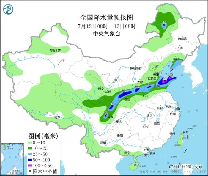 7月12日08時至13日08時,甘肅東南部、陜西中部和西南部、山西南部、河北南部、河南北部、山東中北部、遼寧東南部以及四川盆地西北部等地部分地區(qū)有大到暴雨,其中,山東北部等地局部地區(qū)有大暴雨(100~150毫米)。
