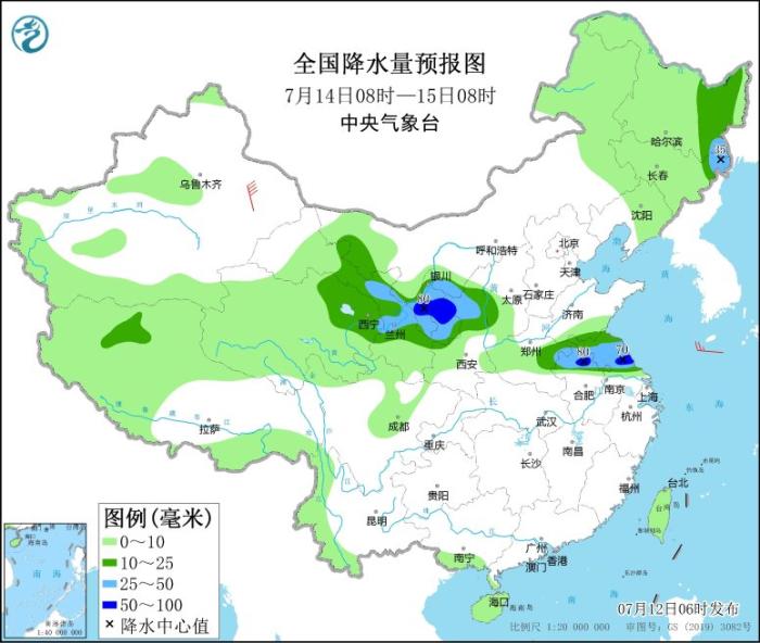 7月14日08時至15日08時,內(nèi)蒙古西部、西北地區(qū)東部、河南東部、山東南部、安徽北部、江蘇中北部、黑龍江東部、吉林東北部等地部分地區(qū)有中到大雨,其中,甘肅東部、寧夏中部、陜西北部、安徽北部、江蘇中部等地部分地區(qū)有暴雨(50~80毫米)。新疆東部部分地區(qū)有6~7級風(fēng)。