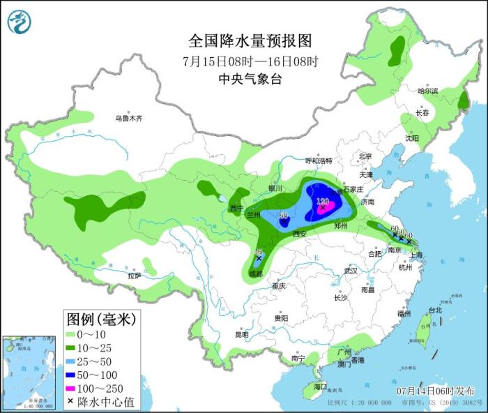 7月14日08時至15日08時,西北地區(qū)東部、江蘇北部、安徽北部等地部分地區(qū)有大到暴雨,其中,甘肅東部、陜西北部等地局地有大暴雨(100~120毫米)。內(nèi)蒙古東北部和中部、黑龍江東北部、新疆沿天山地區(qū)等地部分地區(qū)有4~6級風。