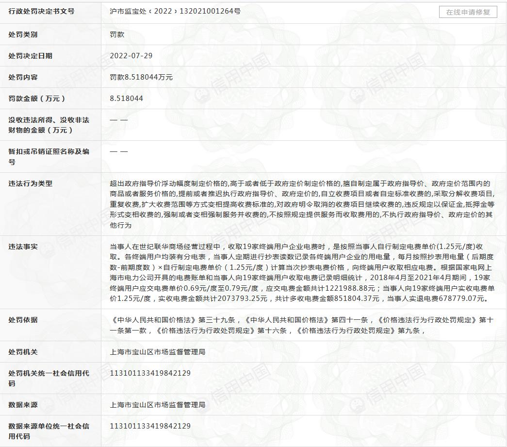 世紀(jì)聯(lián)華加價(jià)收取電費(fèi)被罰8.5萬(wàn)