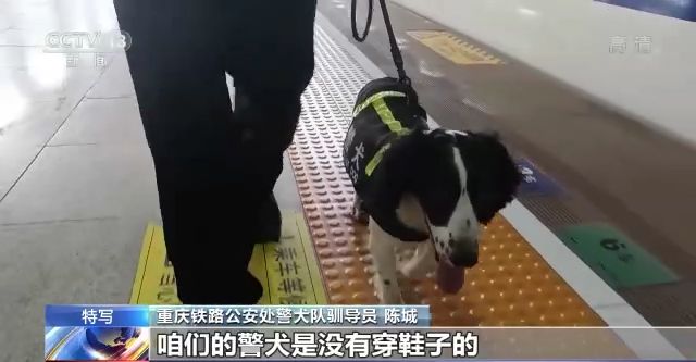 重慶鐵路公安處警犬隊(duì)馴導(dǎo)員 陳城:現(xiàn)在地表溫度是非常高的,你看現(xiàn)在都是接近60℃了,咱們的警犬是沒有穿鞋子的,相當(dāng)于就是(它的)肉墊直接接觸地面,它是非常痛苦的,所以咱們(正午)基本上不會在室外工作了。