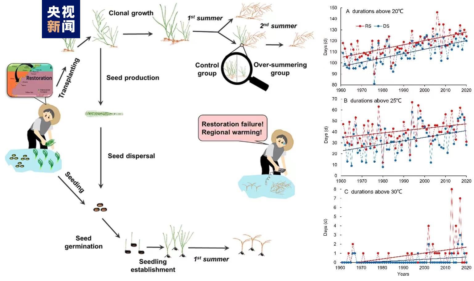 為確定鰻草地理分布北移是否由區(qū)域變暖所致,2016年至2021年期間,科研人員從青島灣獲取鰻草植株和種子,在日照石臼所海域共開展了16次鰻草植株移植和種子種植實驗,監(jiān)測海草生長狀況及水溫等環(huán)境參數(shù),并進(jìn)行海草生化分析和轉(zhuǎn)錄組分析。