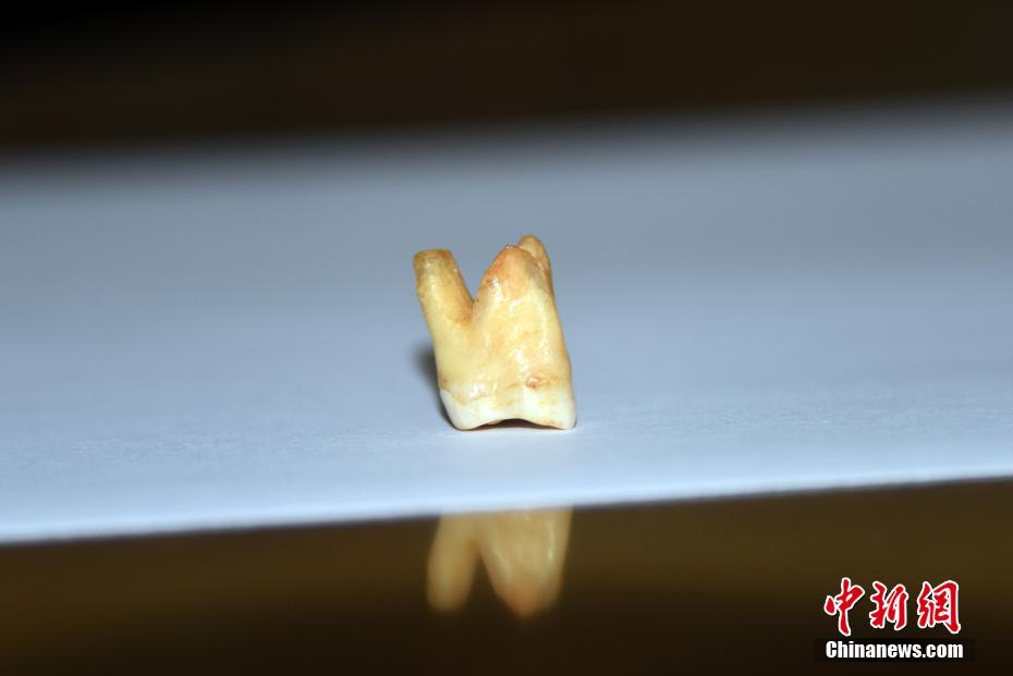 中國科學(xué)院古脊椎動物與古人類研究所(中科院古脊椎所)青年研究員吳妍帶領(lǐng)的研究團隊,通過對湖南道縣福巖洞遺址出土的、迄今所知東亞最早現(xiàn)代人(8-12萬年前)的牙齒化石進行牙結(jié)石提取與分析,最新研究發(fā)現(xiàn)東亞最早現(xiàn)代人植物類食物的直接證據(jù),并發(fā)現(xiàn)當(dāng)時的古人類就已經(jīng)有了剔牙行為。這項重要研究發(fā)現(xiàn)的成果論文,已在國際專業(yè)學(xué)術(shù)期刊《植物科學(xué)前沿》發(fā)表。圖為9月7日,北京,中科院古脊椎所標(biāo)本館,展示一顆用于本次研究的湖南道縣福巖洞遺址出土、8-12萬年前東亞最早現(xiàn)代人牙齒化石標(biāo)本。 中新社記者 孫自法 攝