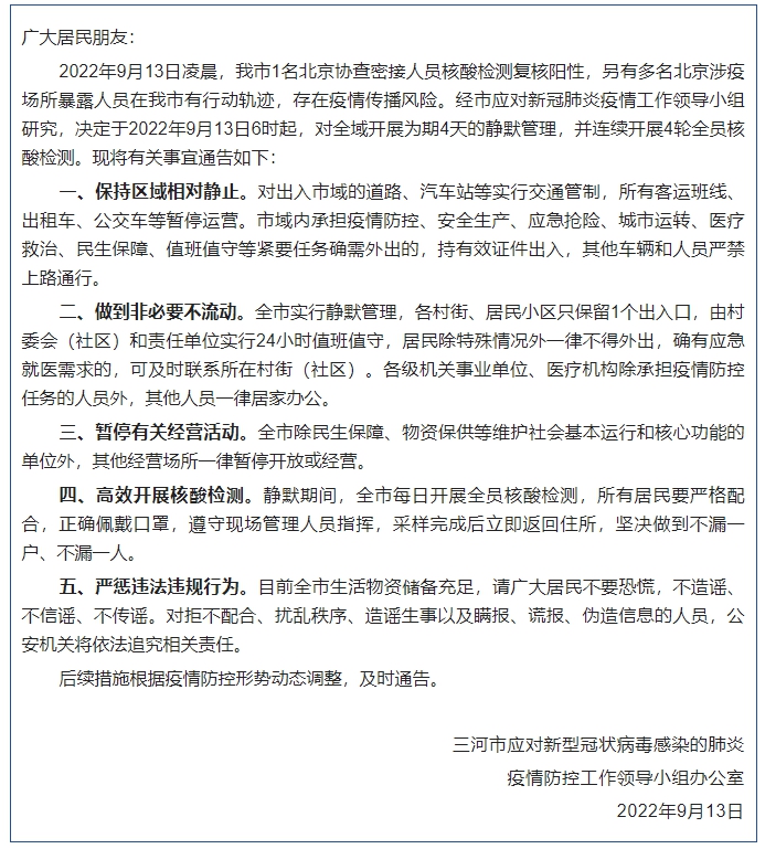 河北省三河市應對新型冠狀病毒感染的肺炎疫情防控工作領導小組辦公室9月13日發(fā)布通告,決定于2022年9月13日6時起,對全域開展為期4天的靜默管理,并連續(xù)開展4輪全員核酸檢測。通告全文如下: