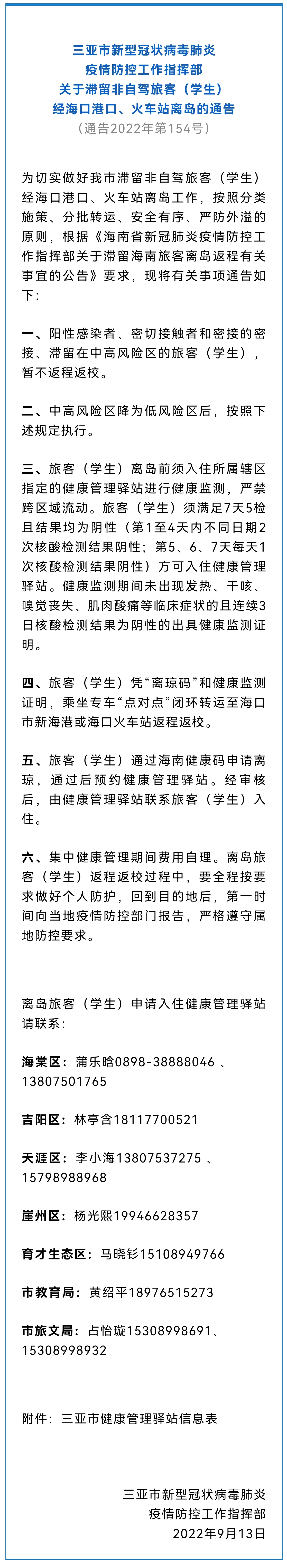 9月13日,總臺(tái)記者從三亞市新型冠狀病毒肺炎疫情防控工作指揮部獲悉,為切實(shí)做好三亞市滯留非自駕旅客(學(xué)生)經(jīng)海口港口、火車站離島工作,按照分類施策、分批轉(zhuǎn)運(yùn)、安全有序、嚴(yán)防外溢的原則,根據(jù)《海南省新冠肺炎疫情防控工作指揮部關(guān)于滯留海南旅客離島返程有關(guān)事宜的公告》要求,現(xiàn)將有關(guān)事項(xiàng)通告如下: