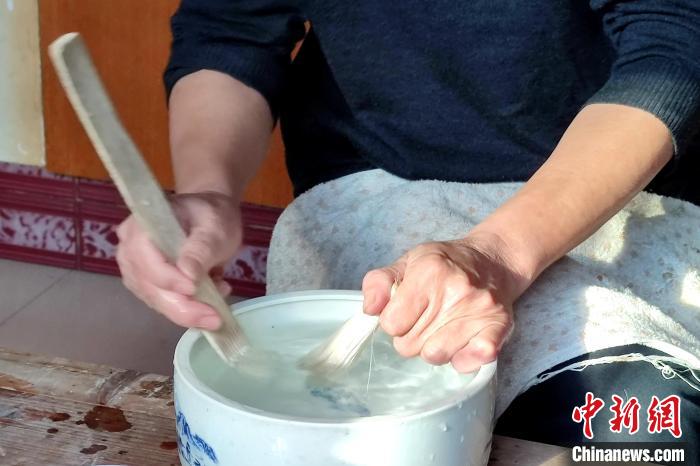 中新網(wǎng)泉州10月28日電 (吳冠標(biāo))一撮精心挑選的羊毛、一把挑毛刀,一支牛骨梳、一個盛滿了水的水盆,在數(shù)小時的反復(fù)清洗梳理中,藍(lán)田毛筆筆頭漸露雛形……走進(jìn)福建泉州安溪文益筆莊,毛筆制作技藝非遺傳承人張才枝正熟練地制作毛筆筆頭。