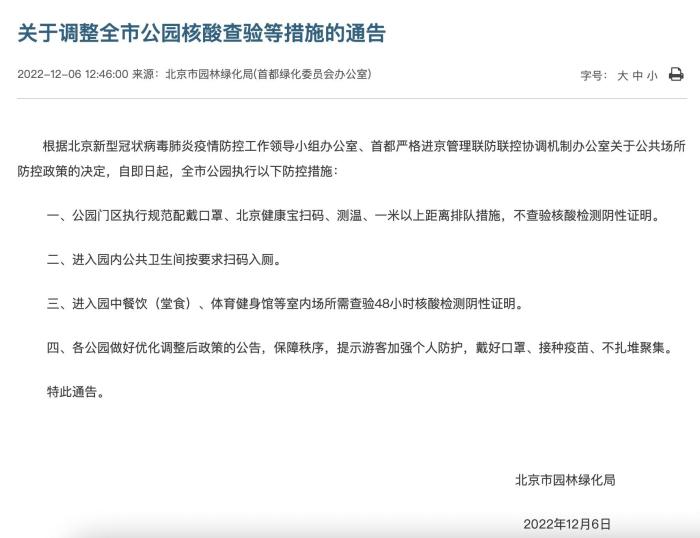 關(guān)于調(diào)整全市公園核酸查驗(yàn)等措施的通告?!”本┦袌@林綠化局官網(wǎng) 攝
