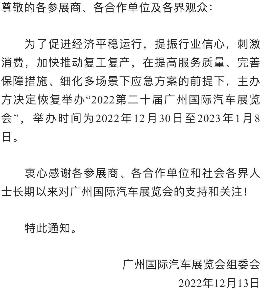 中新網(wǎng)12月13日電 據(jù)“廣州國(guó)際汽車展”公眾號(hào)消息,廣州國(guó)際汽車展覽會(huì)組委會(huì)12月13日發(fā)布通知,為了促進(jìn)經(jīng)濟(jì)平穩(wěn)運(yùn)行,提振行業(yè)信心,刺激消費(fèi),加快推動(dòng)復(fù)工復(fù)產(chǎn),在提高服務(wù)質(zhì)量、完善保障措施、細(xì)化多場(chǎng)景下應(yīng)急方案的前提下,主辦方?jīng)Q定恢復(fù)舉辦“2022第二十屆廣州國(guó)際汽車展覽會(huì)”,舉辦時(shí)間為2022年12月30日至2023年1月8日。(中新財(cái)經(jīng))