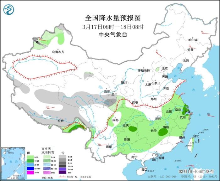 3月16日08時(shí)至17日08時(shí),新疆沿天山地區(qū)和伊犁河谷、西藏東部和南部、青海東部和南部、川西高原等地部分地區(qū)有小到中雪或雨夾雪,局地有大雪(5~7毫米)。黃淮西部、江淮西部、江漢、江南北部和西部、西南地區(qū)東部等地部分地區(qū)有中到大雨,其中,貴州東部、湖南北部等地局地有暴雨(50~80毫米)。內(nèi)蒙古中東部、東北地區(qū)、浙江北部等地部分地區(qū)有4~6級(jí)風(fēng)。