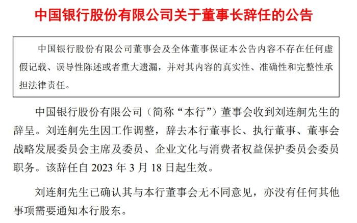 中國銀行:劉連舸辭去董事長等職務
