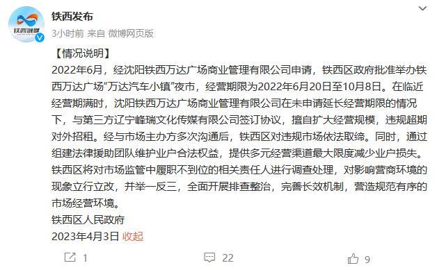 中新網(wǎng)4月3日電 鐵西發(fā)布官方微博3日發(fā)布情況說明:2022年6月,經(jīng)沈陽鐵西萬達(dá)廣場商業(yè)管理有限公司申請,鐵西區(qū)政府批準(zhǔn)舉辦鐵西萬達(dá)廣場“萬達(dá)汽車小鎮(zhèn)”夜市,經(jīng)營期限為2022年6月20日至10月8日。在臨近經(jīng)營期滿時,沈陽鐵西萬達(dá)廣場商業(yè)管理有限公司在未申請延長經(jīng)營期限的情況下,與第三方遼寧峰瑞文化傳媒有限公司簽訂協(xié)議,擅自擴(kuò)大經(jīng)營規(guī)模,違規(guī)超期對外招租。