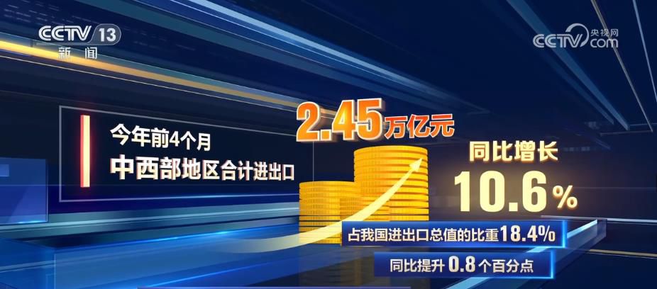 央視網(wǎng)消息:從我國(guó)外貿(mào)區(qū)域結(jié)構(gòu)來(lái)看,今年前4個(gè)月,中西部地區(qū)合計(jì)進(jìn)出口2.45萬(wàn)億元,同比增長(zhǎng)10.6%,占我國(guó)進(jìn)出口總值的比重18.4%,同比提升0.8個(gè)百分點(diǎn)。我國(guó)中西部地區(qū)進(jìn)出口快速增長(zhǎng),增速高出全國(guó)4.8個(gè)百分點(diǎn)。