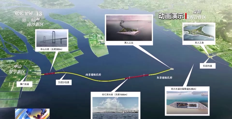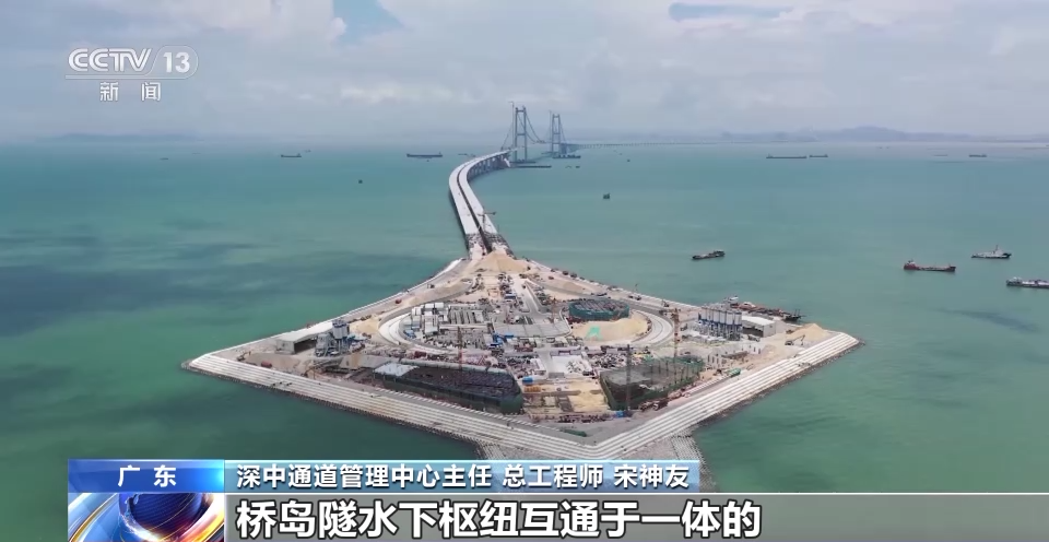 深中通道管理中心主任、總工程師 宋神友:未來(lái),珠江西岸的人跟深圳機(jī)場(chǎng)以及前海實(shí)現(xiàn)快速交通轉(zhuǎn)換,就是通過(guò)在東岸設(shè)置了一個(gè)高速公路水下樞紐互通立交的形式,所以最終這個(gè)項(xiàng)目就是采用了橋島隧水下樞紐互通于一體的跨海集群工程。