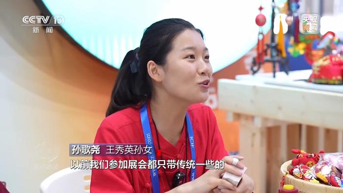 王秀英孫女孫歌堯:第一天人特別多,也有好多參展商們來我這邊參觀想合作,比如給我們一些logo,或者幫他定制一些香包。我們帶動馬莊村300多位村民一起做,1天產(chǎn)量能達到3000個,去年馬莊香包年產(chǎn)值800萬元。