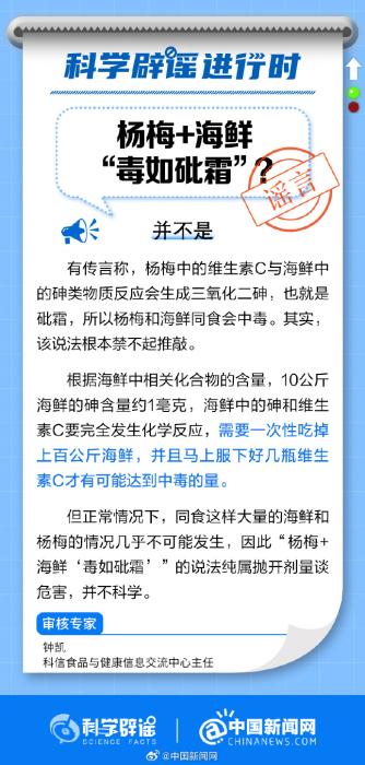 中新網(wǎng)7月14日電 有傳言稱,楊梅中的維生素C與海鮮中的砷類物質(zhì)反應(yīng)會(huì)生成三氧化二砷,也就是砒霜。這個(gè)說法科學(xué)嗎?戳圖片了解真相↓(來源:科學(xué)辟謠、中國新聞網(wǎng)微博)