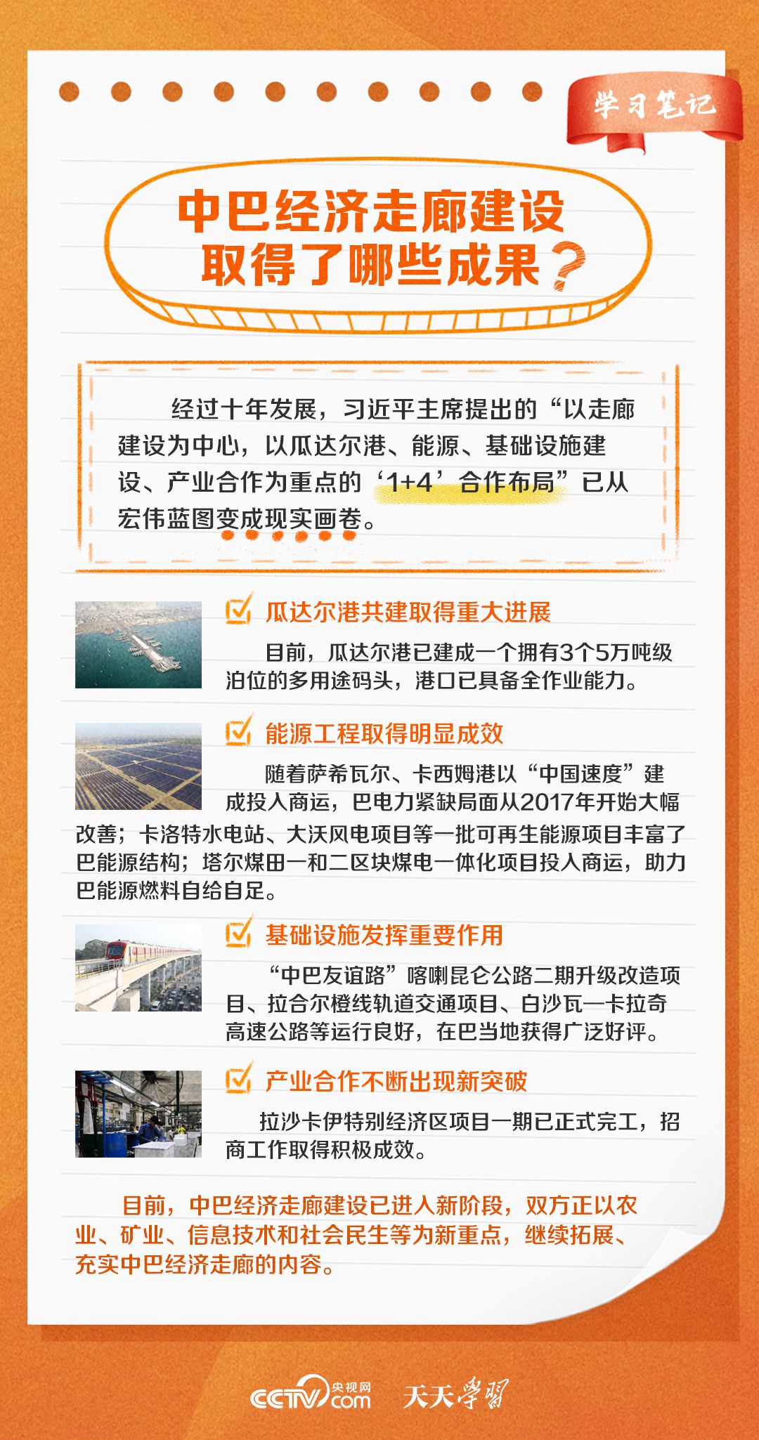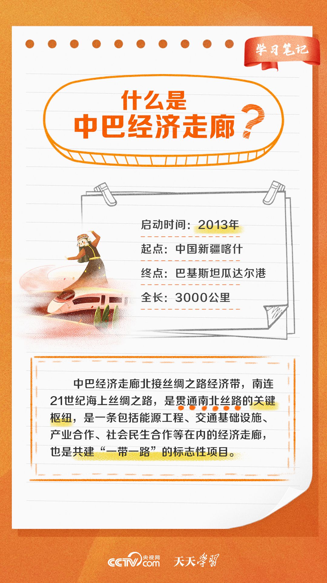 今年是習(xí)近平主席提出共建“一帶一路”倡議十周年,也是中巴經(jīng)濟(jì)走廊啟動(dòng)十周年。經(jīng)過十年的發(fā)展,中巴經(jīng)濟(jì)走廊已成為中巴友誼“新標(biāo)桿”。央視網(wǎng)《天天學(xué)習(xí)·學(xué)習(xí)筆記》特梳理中巴經(jīng)濟(jì)走廊相關(guān)知識(shí)點(diǎn),與您一起學(xué)習(xí)。