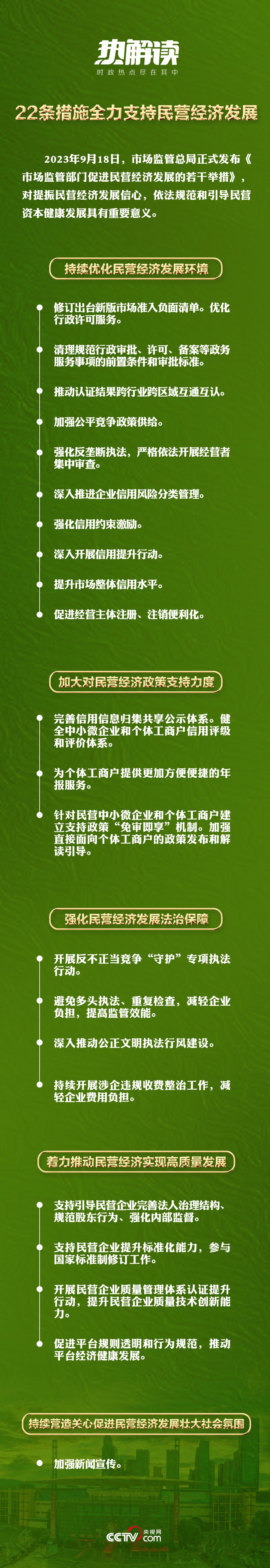 2023年7月14日,中共中央國務(wù)院出臺《關(guān)于促進民營經(jīng)濟發(fā)展壯大的意見》,對促進民營經(jīng)濟發(fā)展壯大作出新的重大部署。2023年9月18日,市場監(jiān)管總局發(fā)布《市場監(jiān)管部門促進民營經(jīng)濟發(fā)展的若干舉措》,通過22條措施為全力支持民營經(jīng)濟發(fā)展設(shè)計了具體落實的“施工圖”。