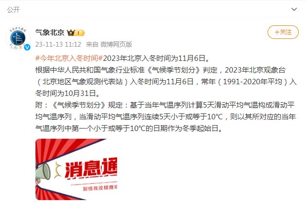 中新網(wǎng)11月13日電 據(jù)北京市氣象局官方微博13日消息,2023年北京入冬時(shí)間為11月6日。根據(jù)中華人民共和國(guó)氣象行業(yè)標(biāo)準(zhǔn)《氣候季節(jié)劃分》判定,2023年北京觀象臺(tái)(北京地區(qū)氣象觀測(cè)代表站)入冬時(shí)間為11月6日,常年(1991-2020年平均)入冬時(shí)間為10月31日。