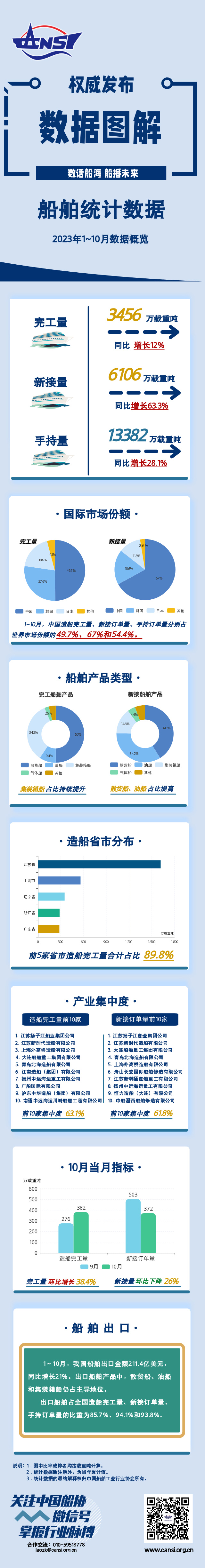 中新網(wǎng)11月17電 據(jù)中國船舶工業(yè)行業(yè)協(xié)會微信公眾號消息,中國船舶工業(yè)行業(yè)協(xié)會發(fā)布1-10月船舶統(tǒng)計數(shù)據(jù)顯示,1-10月,全國造船完工量3456萬載重噸,同比增長12%;新接訂單量6106萬載重噸,同比增長63.3%。截至10月底,手持訂單量13382萬載重噸,同比增長28.1%。1-10月,中國造船完工量、新接訂單量、手持訂單量分別占世界市場份額的49.7%、67%和54.4%。