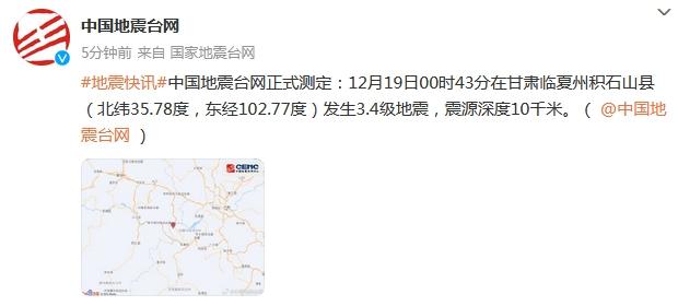 中新網(wǎng)12月19日電 據(jù)中國地震臺網(wǎng)中心官方微博消息,中國地震臺網(wǎng)正式測定:12月19日0時43分在甘肅臨夏州積石山縣(北緯35.78度,東經(jīng)102.77度)發(fā)生3.4級地震,震源深度10千米。