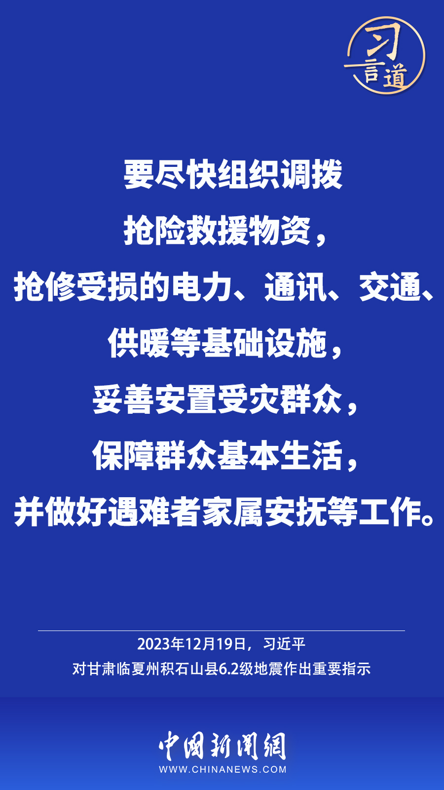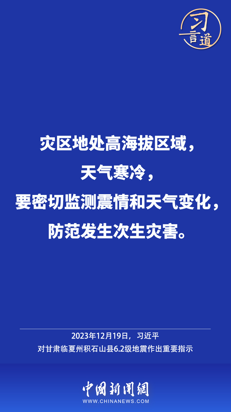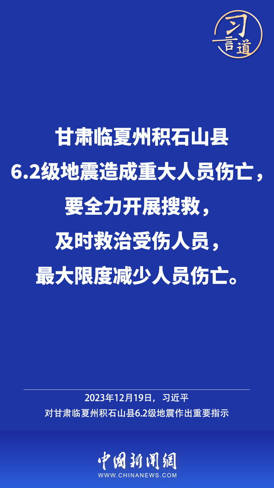 北京時(shí)間12月18日23時(shí)59分,甘肅臨夏州積石山縣發(fā)生6.2級地震,震源深度10公里。地震發(fā)生后,中共中央總書記、國家主席、中央軍委主席習(xí)近平高度重視并作出重要指示——
