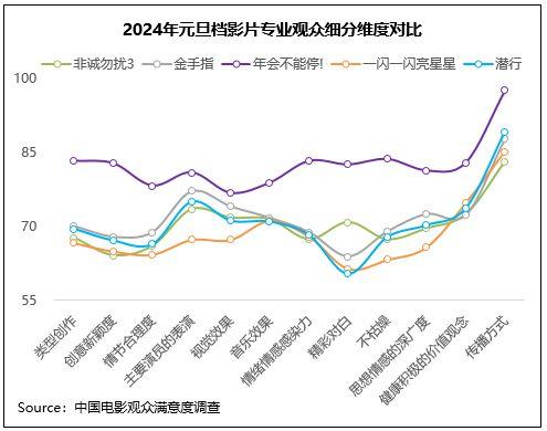 中國(guó)電影觀(guān)眾滿(mǎn)意度調(diào)查 2024年元旦檔調(diào)查結(jié)果顯示,元旦檔電影觀(guān)眾滿(mǎn)意度得分83.0分,環(huán)比增長(zhǎng)0.2分。檔期以多元化且高契合度的影片供給陪伴觀(guān)眾跨年,得到了較高的滿(mǎn)意度評(píng)價(jià),5部影片中有4部進(jìn)入歷史調(diào)查19部元旦檔影片的滿(mǎn)意度前十,喜劇《年會(huì)不能停!》以84.2分領(lǐng)銜,《金手指》83.0分居第二位,《潛行》《一閃一閃亮星星》均超82分,《非誠(chéng)勿擾3》超81分。