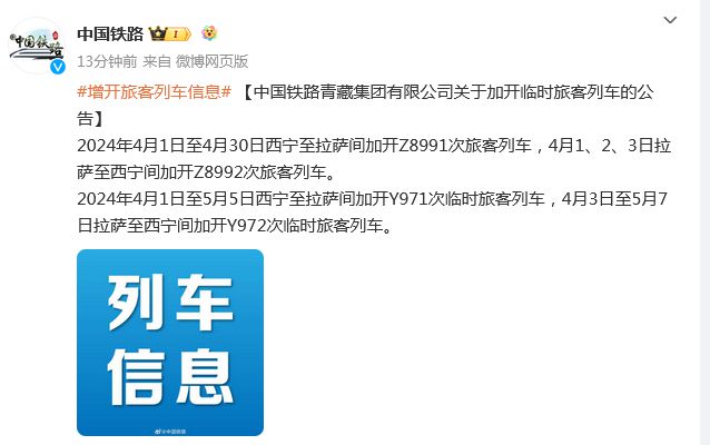 中新網3月22日電 據中國國家鐵路集團有限公司官方微博消息,中國鐵路青藏集團有限公司3月22日發(fā)布關于加開臨時旅客列車的公告:2024年4月1日至4月30日西寧至拉薩間加開Z8991次旅客列車,4月1、2、3日拉薩至西寧間加開Z8992次旅客列車。2024年4月1日至5月5日西寧至拉薩間加開Y971次臨時旅客列車,4月3日至5月7日拉薩至西寧間加開Y972次臨時旅客列車。